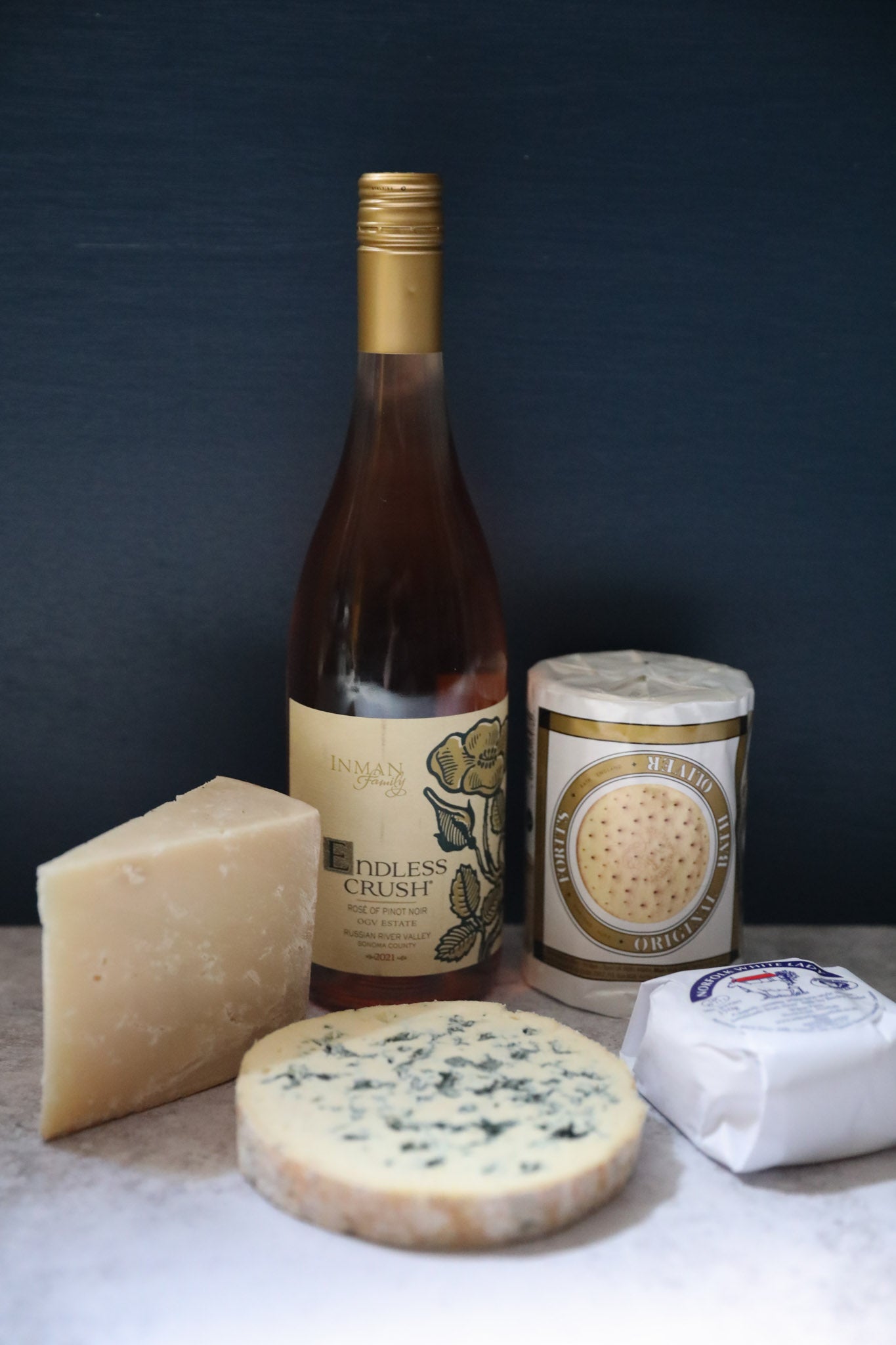Each Endless Crush Wine & Cheese Tasting Pack includes: 1 x Bottle of Endless Crush Rosé, 3 paired cheeses (roughly 200g each, excluding individual cheeses) and a set of tasting notes. This gift pack will be packed and presented as a hamper. *Photo for display purposes only. Crackers not included.